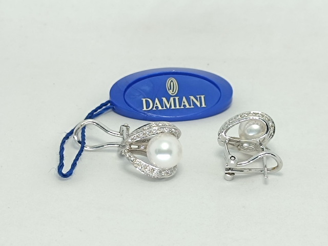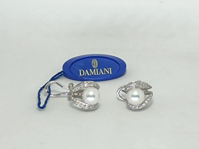 Splendidi ed eleganti orecchini in oro bianco 18kt con perle giapponesi coltivate e diamanti taglio brillante tot. ct. 0,40 H. Diam. perle 8/7,5. Peso tot. gr. 7,60. Made in Italy. Mikawa by Damiani. Ref. MOM44176 - N88374Q. Scatola e garanzia originali.