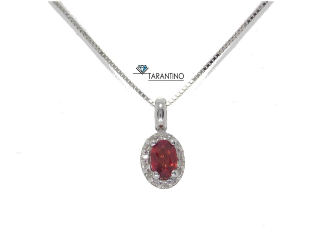 Collana da donna, prodotta da GA diamond Valenza, referenza articolo GADV 14/70 realizzata in oro bianco 750%, impreziosita da diamanti taglio brillante, 0.14 centesimi di carato, colore G, qualità SI, e da un rubino 0.70 centesimi di carato.