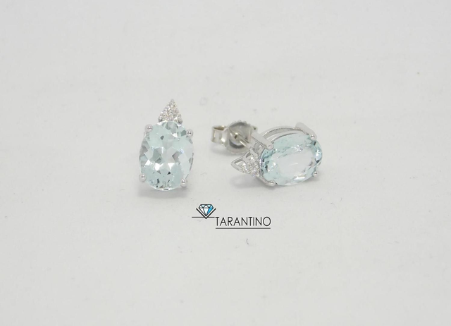 Orecchini In Oro 750‰, Con Diamanti Con Punto Di Caratura 0.06 Di Colore G E Purezza VS, Acquamarina Ovale Di ct. 3.50 0,80.