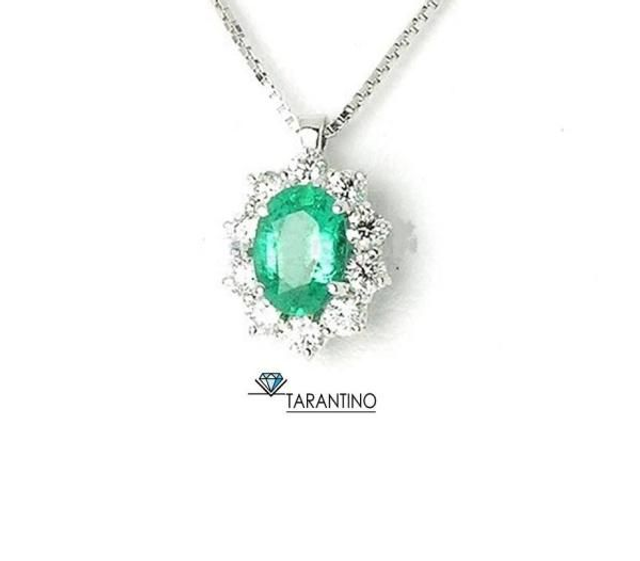 collana con Smeraldo da ct. 0,89, in oro 18 kt con 12 diamanti 0,36 ct totali. La collana è modello veneziana è corredato da garanzia e certificato di autenticità del prodotto dei diamanti, delle pietre preziose ed il titolo dell'oro.