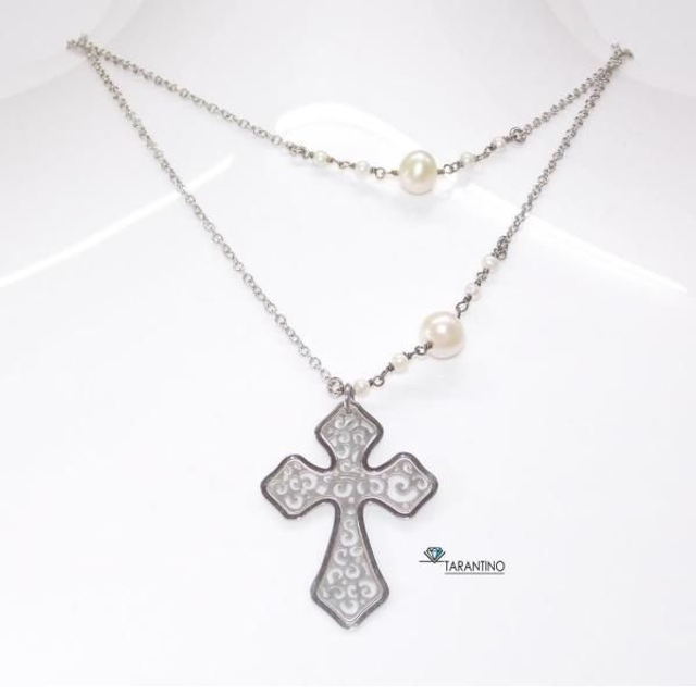Molto trendy questo collier in argento 925/1000 con ciondolo croce in argento e perle Oriente in versione anche rosè